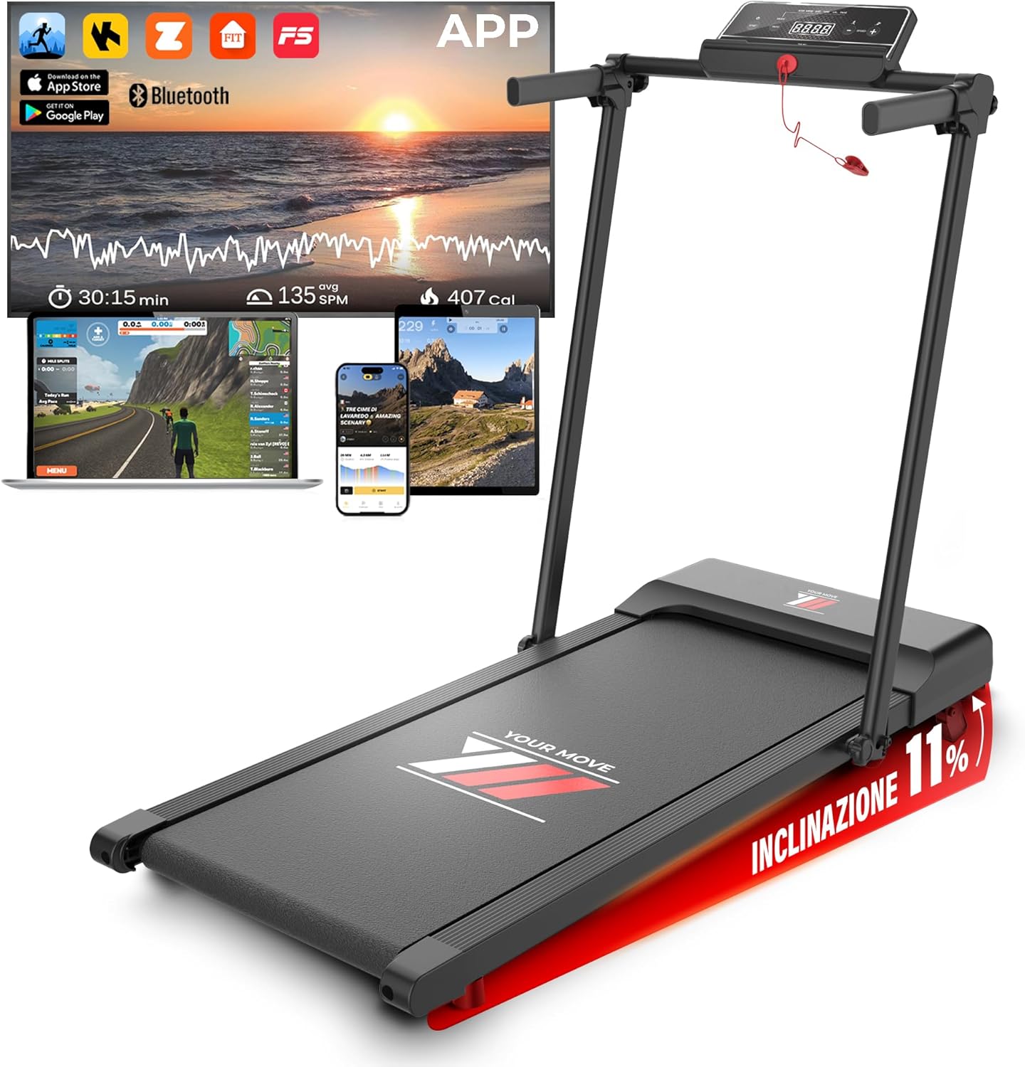 Scopri YM Tapis Roulant Salvaspazio NEXT 1000 Your Move: allenati fino a 12 km/h con inclinazione e maxi superficie da 42 cm, pieghevole e robusto con assistenza italiana